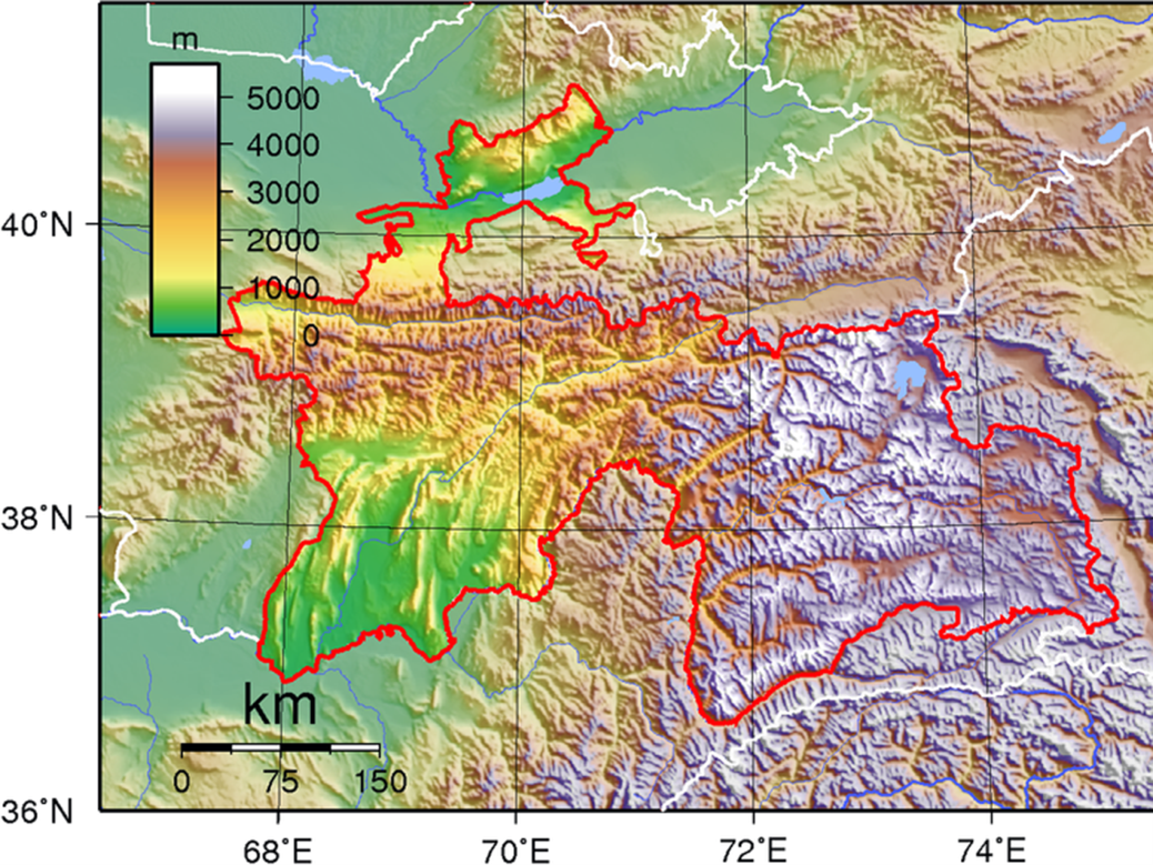 نقشهبرداری زمین توسط حوزههای کوهستانی با یخچالهای طبیعی بیشمار و قلّههای برفی که از درّهها متفرق شدهاند، مشخص میشوند. (درّههایی از قبیل زرافشان، قاراتگین، بدخشان و درّههای کوچکتر) جایی که زراعت توسعه یافته است و زیستگاهها واقع شدهاند. مرغزارهایی از قبیل کولاب، وخش، حصار و خجند چیزی حدود 7 درصد منطقه را تشکیل میدهند. خاک به خاطر تنوّعی که بر حسب ارتفاع دارد، منحصر به فرد است. با نگاهی به بلندیها، به راحتی میتوان انواع خاک را اینگونه شناسایی کرد.