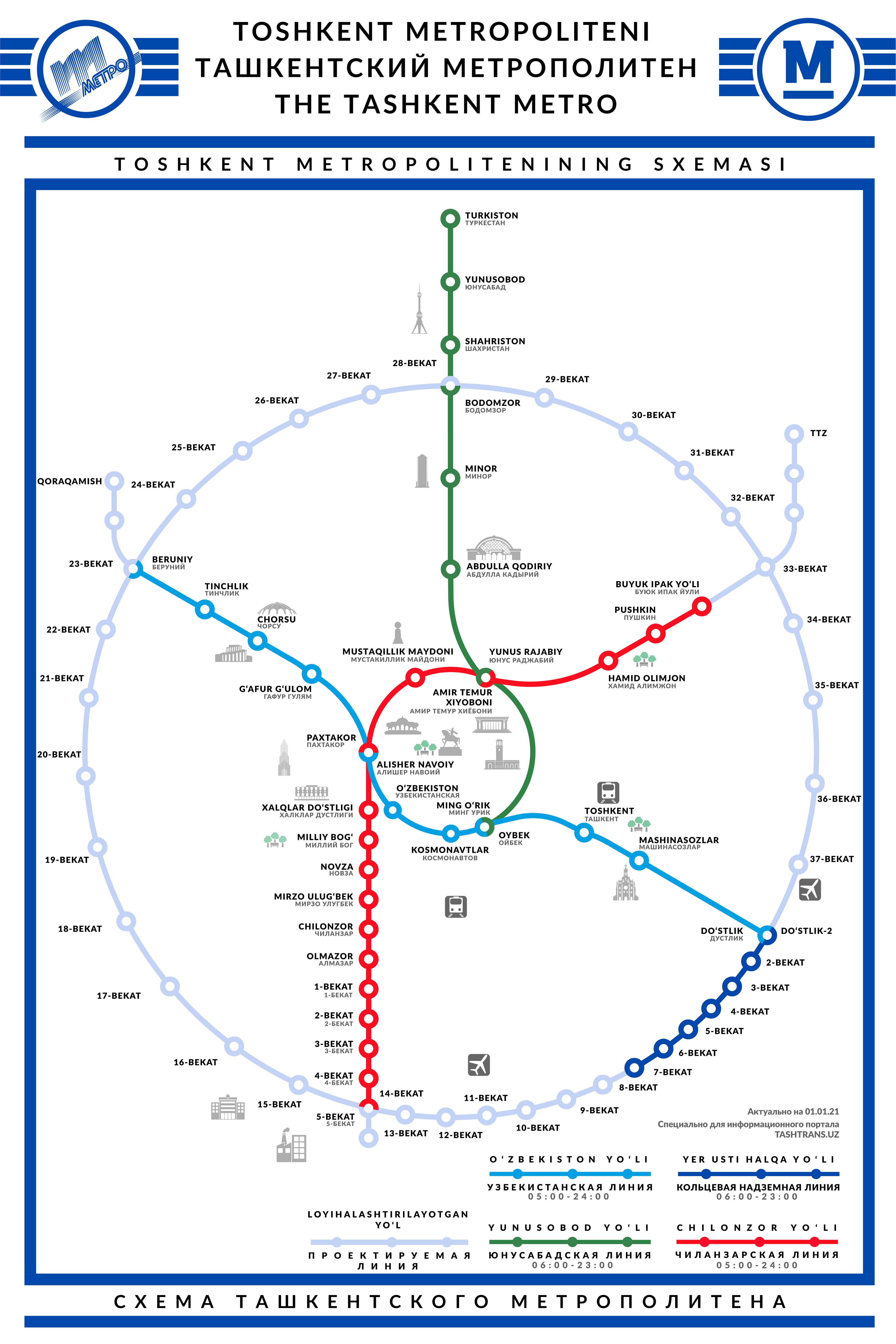 متروی تاشکند یکی از جاذبههای دیدنی در این شهر است. شاید شگفتزده شوید که متروی این شهر چقدر آثار هنری زیبایی دارد. آثار هنری در متروهای این شهر ترکیبی از شکوه هنری شوروی و درک مدرنیته هنرمندان ازبک است. این مترو در سال ۱۹۷۷ تأسیس شده و سه خط و ۲۹ ایستگاه دارد. هر ایستگاه این ایستگاهها هر بینندهای را به گرفتن عکس ترغیب میکنند، اما باید به خاطر داشت که عکسبرداری در متروی تاشکند کاملاً ممنوع است و در هر ایستگاه پلیسهای زیادی حضور دارند. بنابراین بهتر است خودتان را در مشکل نیندازید و فقط از تماشای این هنر زیبا لذت ببرید. ساعت کاری مترو تاشکند از ساعت ۶ صبح تا نیمه شب است.